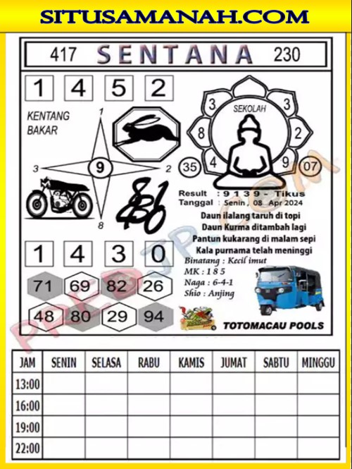 Syair Togel Toto Macau Jitu Hari Ini berisikan ramalan beberapa angka yang dapat keluar dalam togel Toto Macau. Rerata syair ini berisi beberapa angka yang dapat keluar di hari selanjutnya. Syair ini rerata berisi beberapa angka yang tidak sama dan beberapa angka yang ditetapkan teliti oleh banyaknya ahli syair. Dengan begitu, anda bakal mendapatkan kemenangan tambah makin lebih besar dalam judi togel Toto Macau.