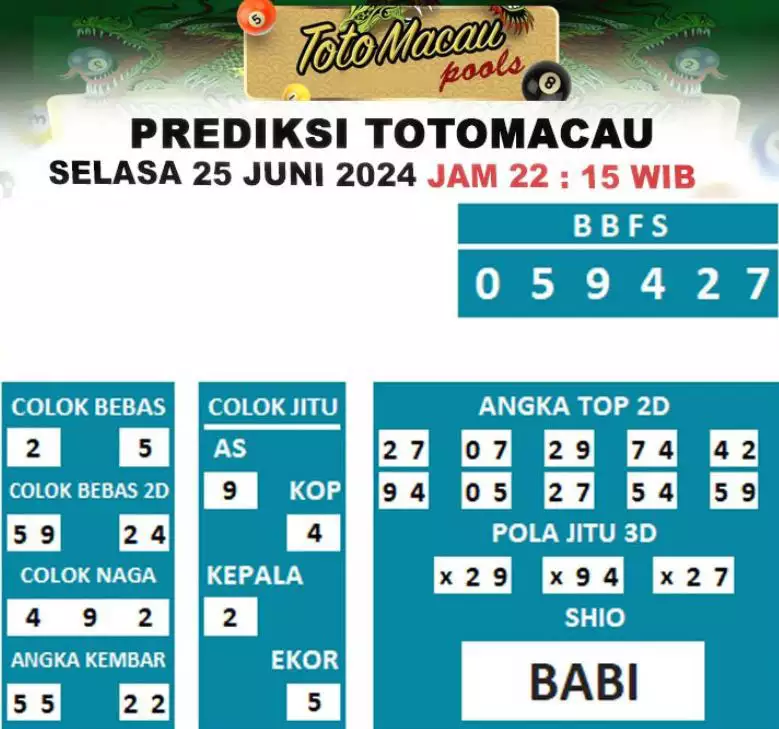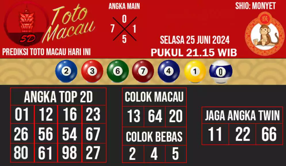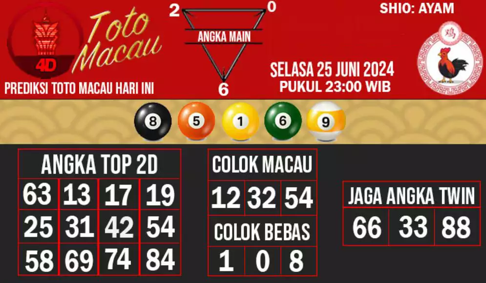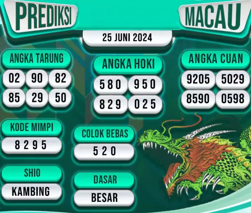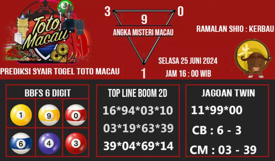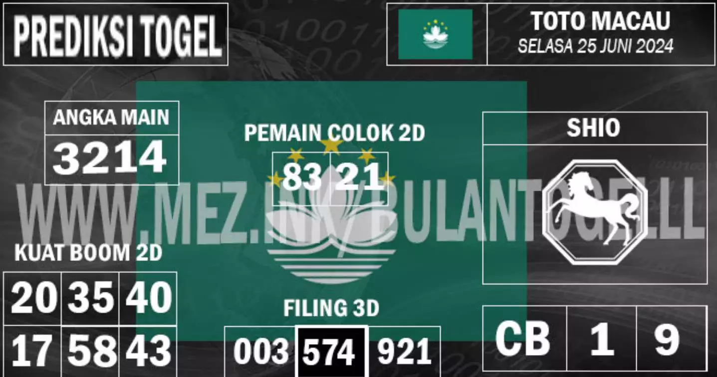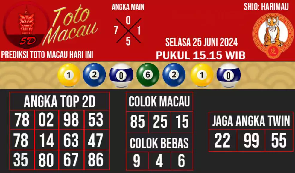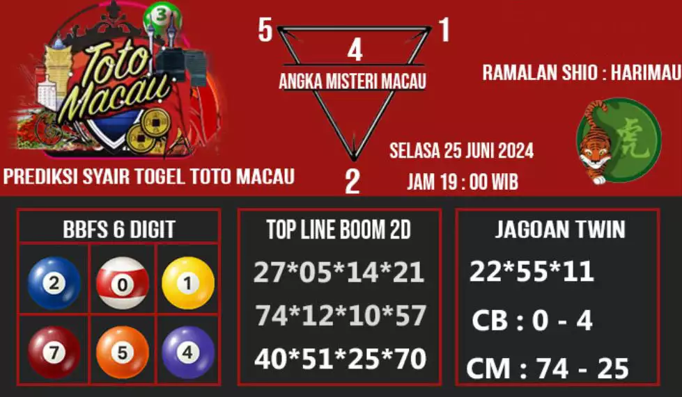 Syair TOTO MACAU salah satunya tipe prediksi togel yang dibikin melihat pola beberapa angka yang ada dalam togel. Syair ini dibikin oleh banyaknya ahli syair yang pakai pengalaman dan hasil tinjauan mereka untuk putuskan beberapa angka yang dapat keluar dalam togel. Maka pemain togel dapat kian mudah untuk menerka angka yang dapat keluar. Tak hanya itu, syair Toto Macau pula bisa membantu pemain togel untuk memperhitungkan angka yang bisa keluar di hari selanjutnya. Dengan begitu, anda bisa mendapatkan keuntungan yang tambah makin lebih besar dalam judi togel Toto Macau.
