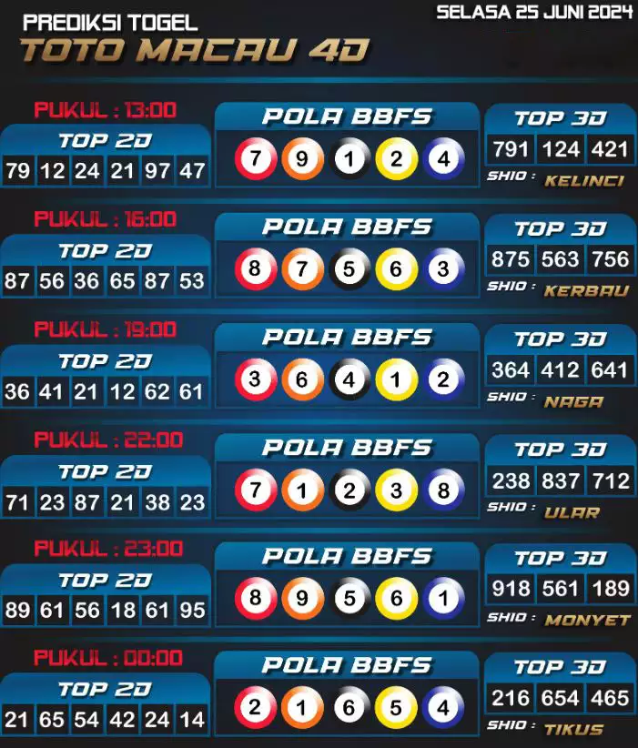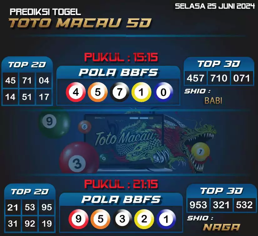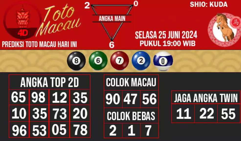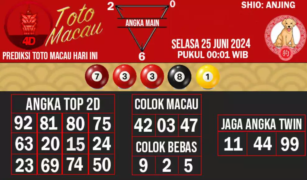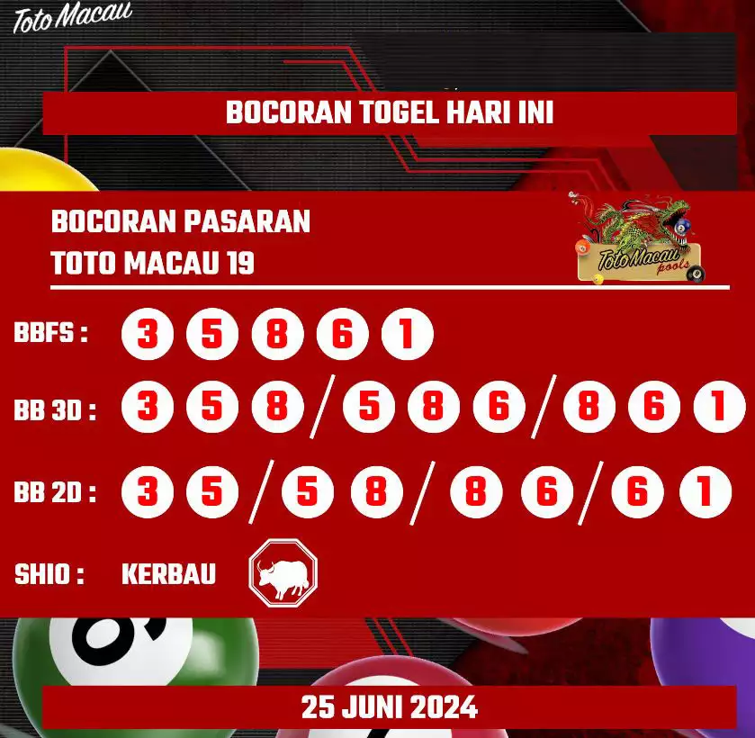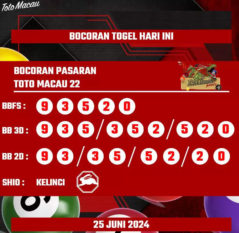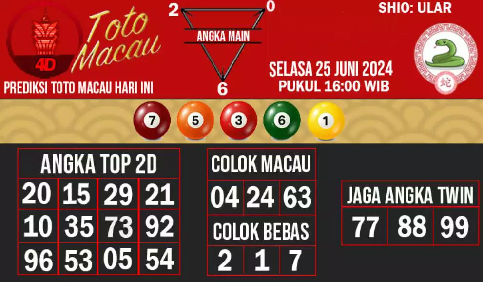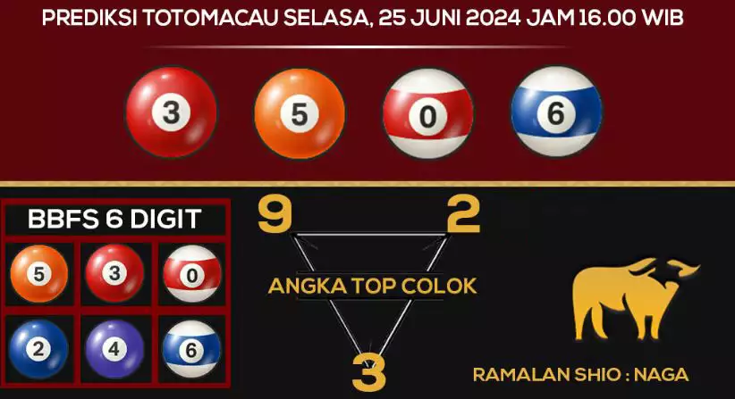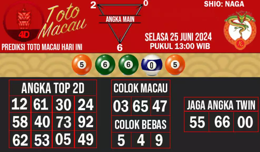 Syair TOTO MACAU salah satunya tipe prediksi togel yang dibikin melihat pola beberapa angka yang ada dalam togel. Syair ini dibikin oleh banyaknya ahli syair yang pakai pengalaman dan hasil tinjauan mereka untuk putuskan beberapa angka yang dapat keluar dalam togel. Maka pemain togel dapat kian mudah untuk menerka angka yang dapat keluar. Tak hanya itu, syair Toto Macau pula bisa membantu pemain togel untuk memperhitungkan angka yang bisa keluar di hari selanjutnya. Dengan begitu, anda bisa mendapatkan keuntungan yang tambah makin lebih besar dalam judi togel Toto Macau.