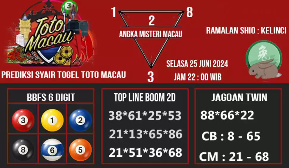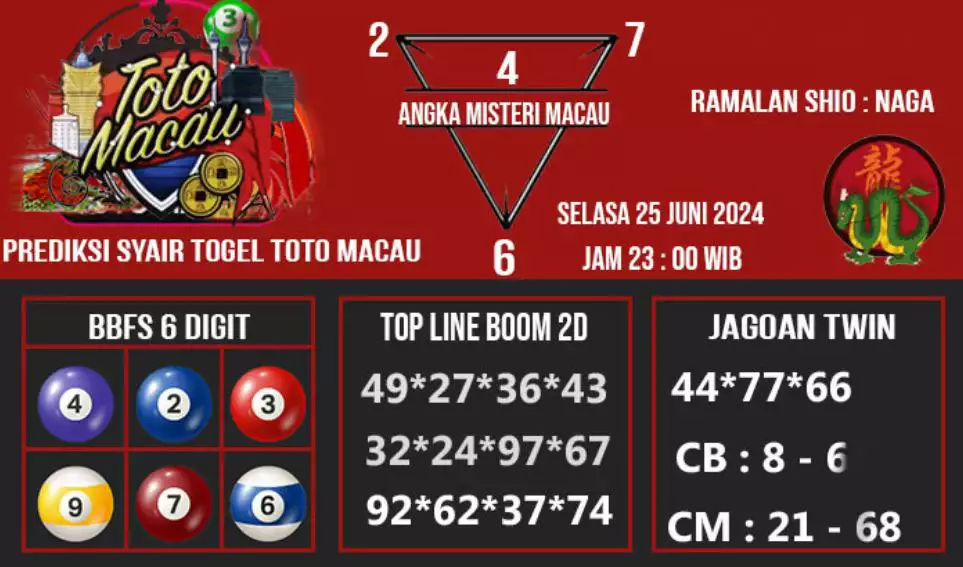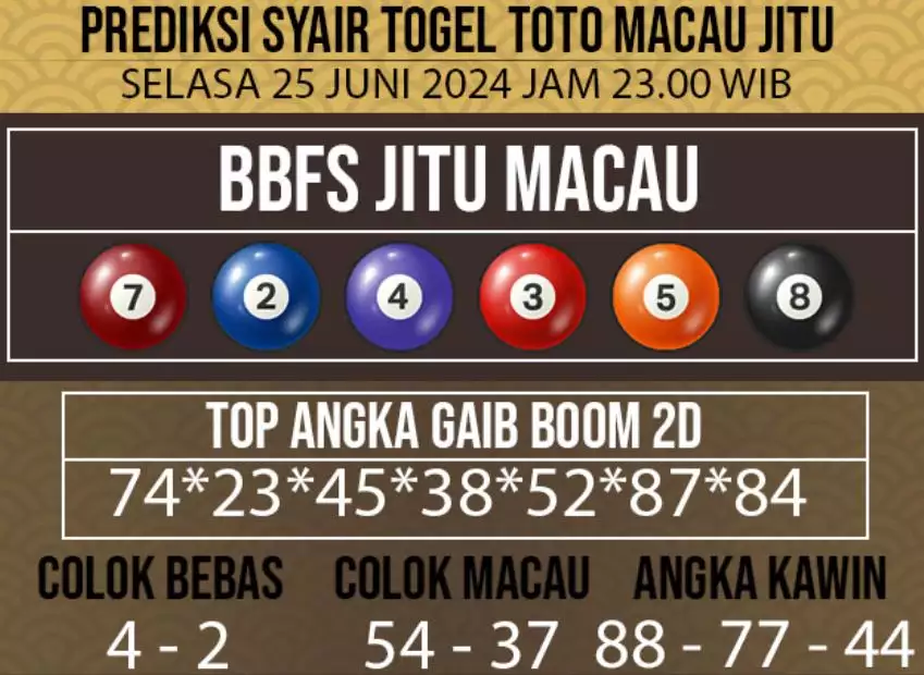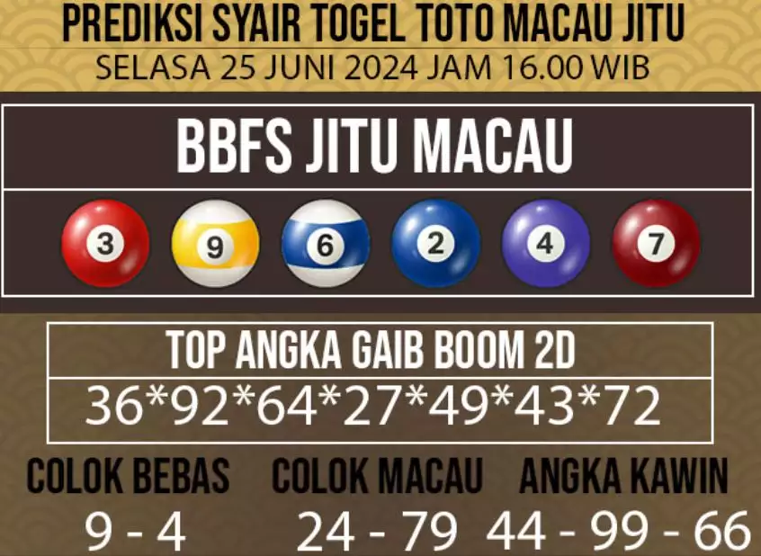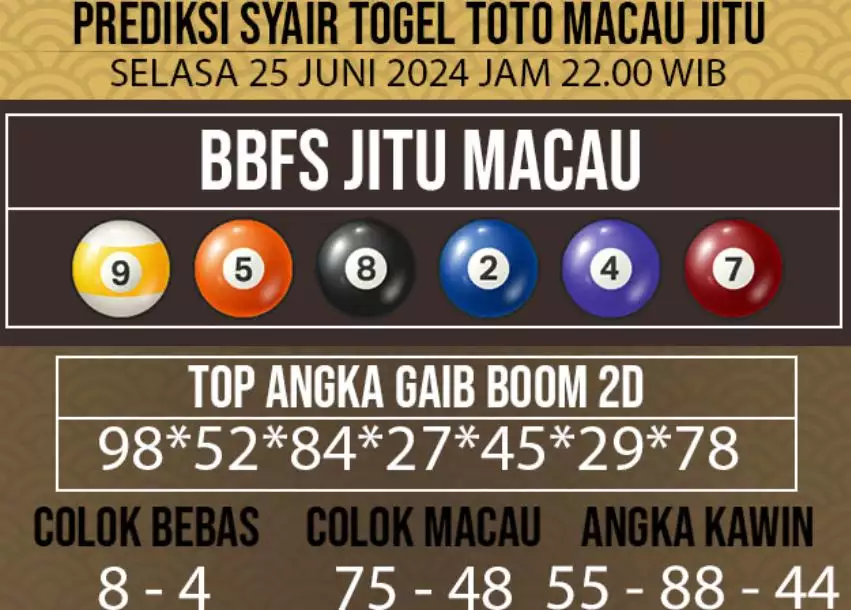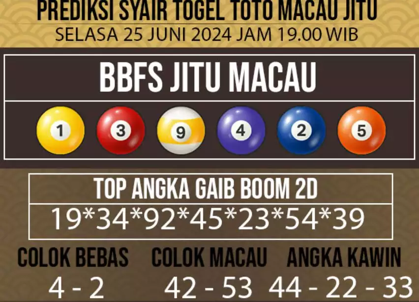 Syair Togel Toto Macau Jitu Hari Ini berisikan ramalan beberapa angka yang dapat keluar dalam togel Toto Macau. Rerata syair ini berisi beberapa angka yang dapat keluar di hari selanjutnya. Syair ini rerata berisi beberapa angka yang tidak sama dan beberapa angka yang ditetapkan teliti oleh banyaknya ahli syair. Dengan begitu, anda bakal mendapatkan kemenangan tambah makin lebih besar dalam judi togel Toto Macau.